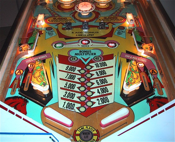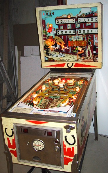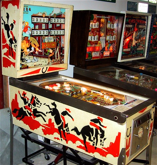 Bronco Story: Bronco was the first "EM" pinball machine I owned. I bought it at the urging of my wife who wanted a pinball machine with a horse theme and "the bells". She likes the slower play of the EMs and was bugging me to get one. This particular machine was offered for sale on the Mr. Pinball classifieds by a local seller about 15 minutes away. Needless to say we jumped at the sale and picked up the machine. It was a pretty uneventful purchase for me (every pinball purchase or sale I do seems to have a saga attached to it!) The machine worked fine from the start and was enjoyed for almost two years. I grew tired of it after about one day (it doesn't even have any slingshot kickers!), but it was enjoyed by visitors who where a bit too shy to step up to the newer machines. Typical of Gottlieb pins of the era, it has a symmetrical design (both sides of the playfield are the same) and plays very slowly. An acquaintance of ours husband owns an antique "marketplace" in town and asked me if I was interested in selling one of my machines there. He was doing up a soda shop type thing with an actual fountain counter setup, an old bubbler jukebox and some restored Vendo Coke machines. He said than an EM pinball would be a wonderful compliment. Neither of my other two EMs (Gottlieb's Masquerade, 1965 and Bally's Captain Fantastic) are in any shape to sell, so I volunteered to bring over the Bronco since it wasn't something I needed to hang onto. I did a quick shop/restoration job on the machine and it was ready to go! He bought the machine in January of 2002 and it sold in March. |