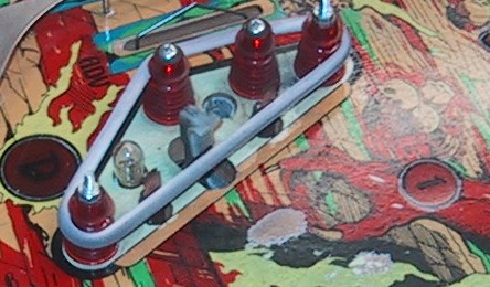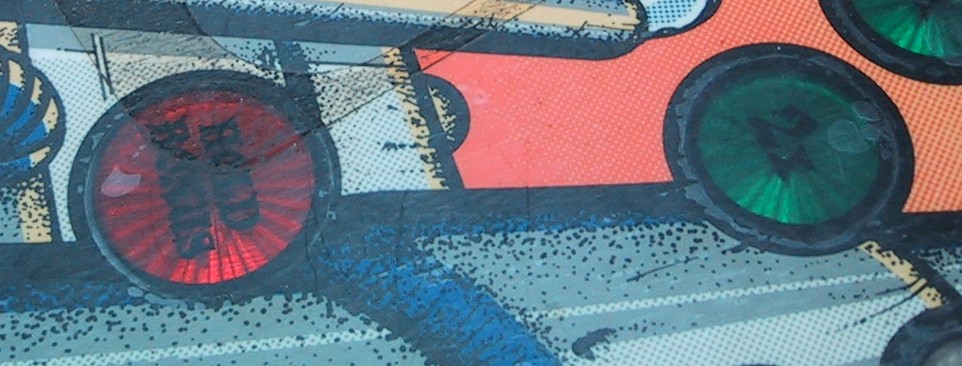 The ball rolling over the inserts has worn off most of the paint around the inserts. Two other area that take quite a beating are around the pop bumpers and the slingshot kickers. The force of the ball being "kicked" back onto the playfield wears a hole in the paint quickly: