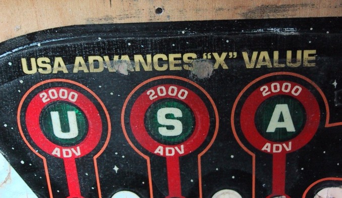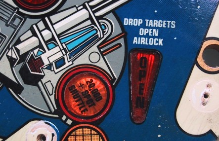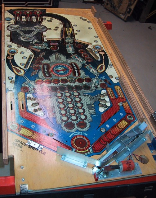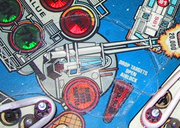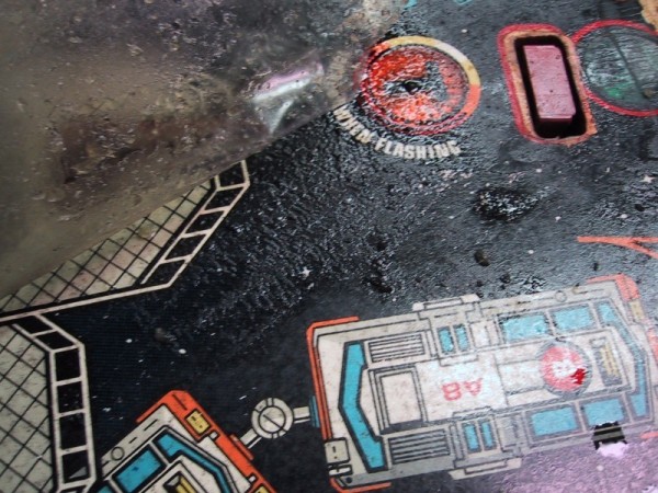Mylar that was applied by operators after receiving the game is much more prone to bubbling then factory applied Mylar. It was usually not applied in ideal conditions or onto a clean playfield surface. Operators tended to apply Mylar after wear problems started to appear. Notice in the photo below that the playfield has been worn down to bear wood under where the Mylar has been applied. The operator of this Space Shuttle tried to minimize their losses by applying Mylar after pronounced wear spots began to appear.