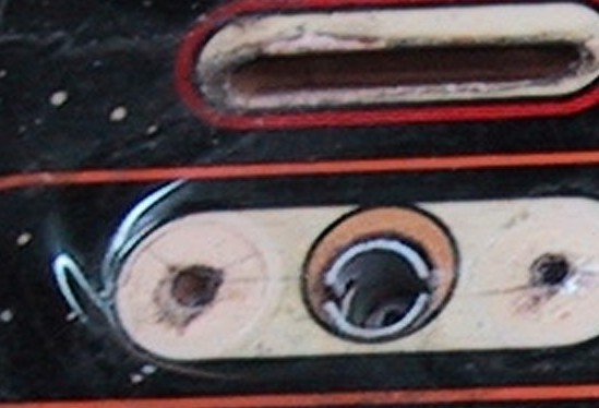 Compare this photo with the one earlier that contained three layers of Mylar. There has been a little lifting of red around the special insert. The white around the edge of the arrow insert is where it is higher than the playfield surface. This will be painted black.