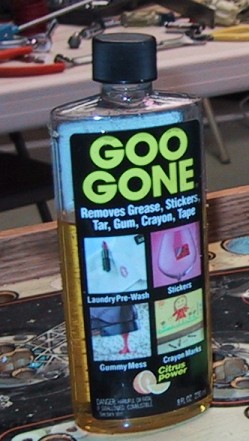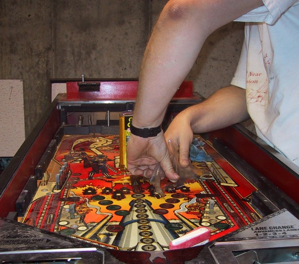 If you search the web or read the pinball newsgroup (rec.games.pinball), you'll read about several methods of removing Mylar. The most common mentioned method is to use a hair dryer to heat up the glue under the Mylar and then pull off the Mylar. I haven't tried this one myself, I would think you would need two people to do it the right way. I have also heard that using the heat method you need to do it all at one shot, and it the Mylar "lays" back down on itself, you're in trouble. The method I'm describing utilizes a solvent to dissolve the glued bonding the Mylar to the playfield. The advantages I find in using the solvent method are that you can do it by yourself and you can do it over a period of time. Need to quit and have dinner? No problem, you've dissolved the adhesive already so it can't stick back down again. Naptha and lighter fluid are two of the solvents mentioned a lot, however the thought of pouring lighter fluid over my playfield disturbs me. Update 1/9/02 - Don't mistake "Goof-off" for "Goo-Gone"! I've talked to a fellow who used "Goof-off" on his High Speed playfield and took off most of the paint! "Goof-off" is a paint remover that is mentioned in some of the on-line pinball how-to guides, but only for the cabinet to remove old Latex paint!! I used "Goof-off" once on an apron to remove a stubborn operator's decal, and it took the paint along with the decal.