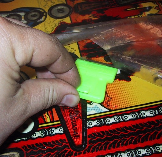 Removing the Mylar This is why you're here! Plan on about 2 hours to get the Mylar off the playfield, and then about another 2 to 4 hours to clean up the left over glue mess. You can stop anywhere in the process and pick-up later, there is nothing time sensitive about the removal process. Pick a good starting point. I like to start on one the side edges, where I can reach easily. Some folks like to start at the top, but its a good reach over the playfield on most games. Squirt Goo-Gone around the seem of Mylar on the edge you're starting on. Depending on how well the Mylar is still adhering to the playfield, you may see the Goo-Gone get sucked under the Mylar via capillary action. This is a good sign! Soak the Mylar with the Goo-Gone, remember, the more Goo-Gone you use the better. Using your razor blade, carefully work it under the edge of the Mylar. Make sure you keep the angle as close to parallel to the playfield as possible.