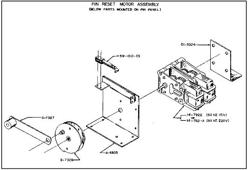 What you're looking at is the pin reset motor and the reset lever. What's missing from this photo is the cam that connects the lever to the motor and controls the leaf switches. The reset motor works somewhat like a car's windshield wipers. Its started by a solenoid on the driver board, but the connection is kept "alive" by a leaf switch being engaged. When the motor has turned a full revolution, a notch in the cam disengages the leaf switch and the motor stops.