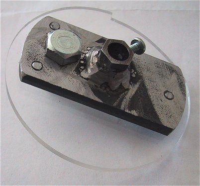 All I had to go on was this drawing from the Williams 1980 parts catalog that showed the missing cam. I started a three month quest to find the missing cam. Multiple posts on rec.games.pinball and other arcade related newsgroups only turned up other folks looking for the cam! I emailed every parts supplier I could find, plus I went through Google and Google Groups looking for web sites and old posts regarding shuffle alley parts. Every vendor I emailed said no part existed outside of a working game. A friend of mine is pretty handy with making oddball parts and had just bought a new welding rig, so I posed the question to him, "could you make one?". I sent him the diagram above and the photo of the where the piece should go. A couple of weeks later he came over with an engineering drawing of the part based on the assembly drawing and a pair of calipers. He measured everything and said "no problem"! A few weeks later the following part showed up: