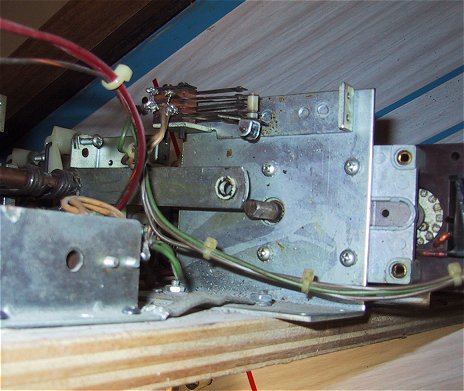 After assembling the game down in the basement and putting in a System 6 MPU with the "alternate" game ROMs, I fired it up for the first time. Lights came on, got some displays, and heard this motor run for about 2 seconds, but no movement from the pins... Hmmm, must be something out of wack. I pulled the pin mechanism out to see what made it tick, and here's what I saw....